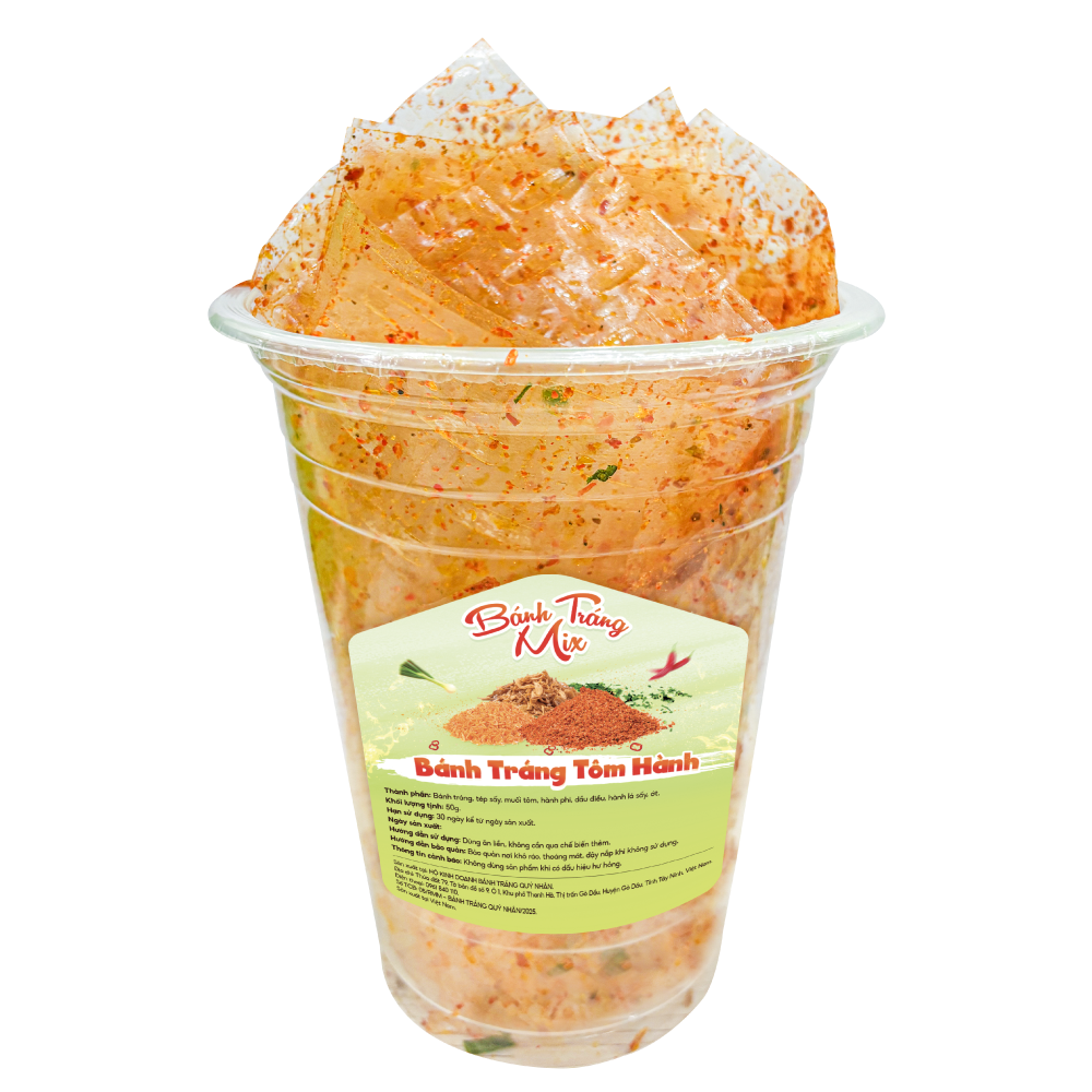 Bánh tráng dai mềm cay the cùng tép sấy giòn rụm, hành phi thơm lừng, muối tôm đậm đà
